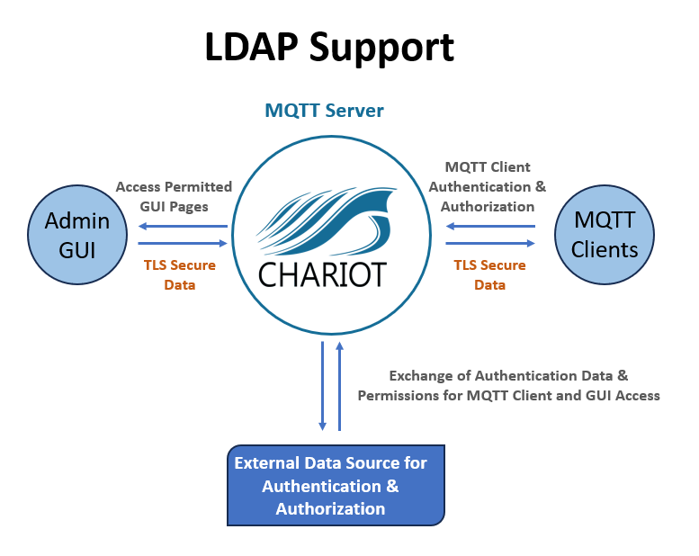 Le service de sécurité de Chariot peut être configuré pour intégrer un domaine LDAP, utilisé lors des phases d’authentification et d’autorisation d’accès à l’interface utilisateur Chariot.