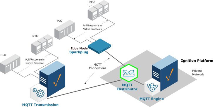 L’utilisation du distributeur MQTT et du module moteur MQTT fournit les composants nécessaires à une infrastructure MOM autonome à partir d’une seule passerelle Ignition. Cette combinaison répond aux exigences des solutions IIoT et des applications SCADA étendues, telles que les solutions de contrôle des oléoducs et gazoducs. Elle est idéale pour les situations où les communications sont restreintes ou coûteuses, comme dans les VSAT ou la connectivité cellulaire. Cette solution est également très efficace pour augmenter le débit de données des solutions d’usine hautes performances.