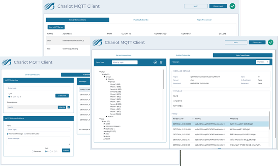 Le client MQTT Chariot gratuit est une application MQTT intégrée qui vous permet de vous connecter simultanément à un nombre illimité de serveurs MQTT, de vous abonner à n’importe quel sujet sur les serveurs MQTT, de publier des messages MQTT et de consulter/interagir avec l’arborescence des sujets MQTT au fur et à mesure de leur publication. L’application permet un contrôle total des niveaux de qualité de service MQTT et de l’indicateur de rétention. C’est un outil de débogage idéal pour les architectures et solutions MQTT.